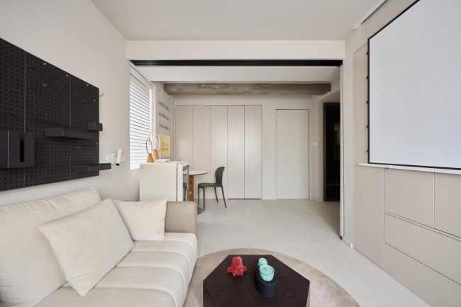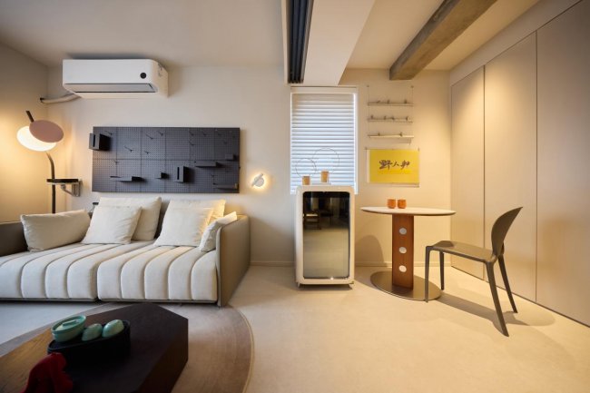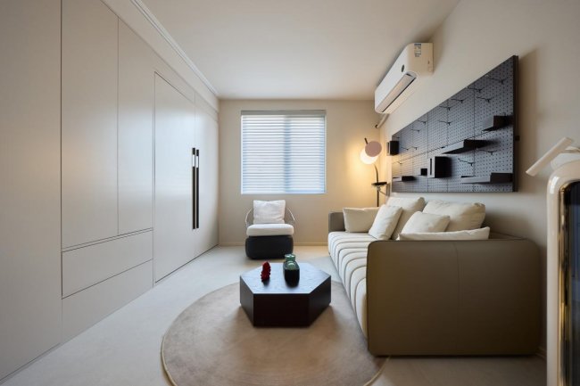 最终,当这间65㎡的老破小以全新的面貌呈现在业主和央视镜头前时,所有人都为之惊叹:杂乱无章的装备拥有了量身定制的收纳系统;斑驳的墙面化为契合主人“热爱自由”的艺术肌理;尴尬的动线变得流畅自如。