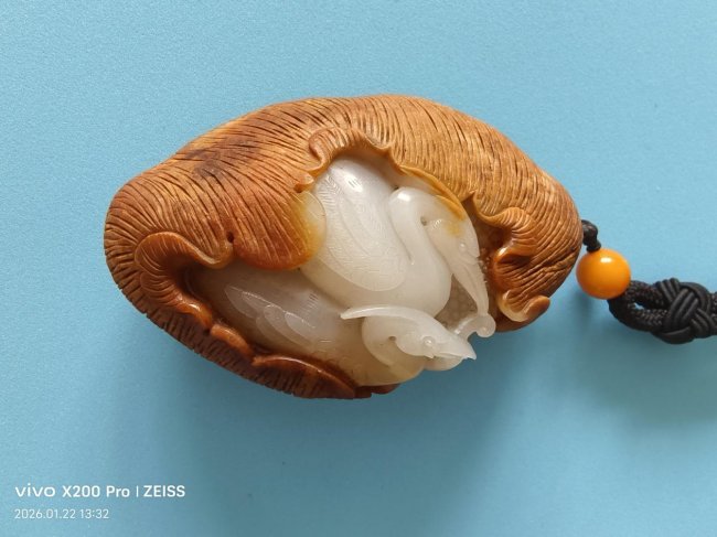 玉雕之道,一在玉质,二在匠心。本品雕工精湛绝伦,章法层次分明,匠人依籽料天然形态随形施艺,将玉石的原生美感与人文巧思完美融合,刀笔之间尽显功底,线条流畅利落、细节精妙入微,既保留了籽料的天然意趣,又赋予器物灵动气韵,工艺文化价值拉满。