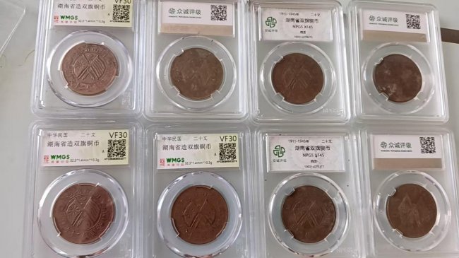 藏品:民国双旗铜元评级币一组(8 枚)版别:湖南省造、河南省造 当二十文铜元评级认证:众诚评级、闻德评级、WMGS 权威鉴定封装品相:传世美品,包浆醇厚,图案文字清晰,无严重缺损核心价值:民国开国币制实证|双省版别成套稀缺|入门 & 进阶收藏硬通货